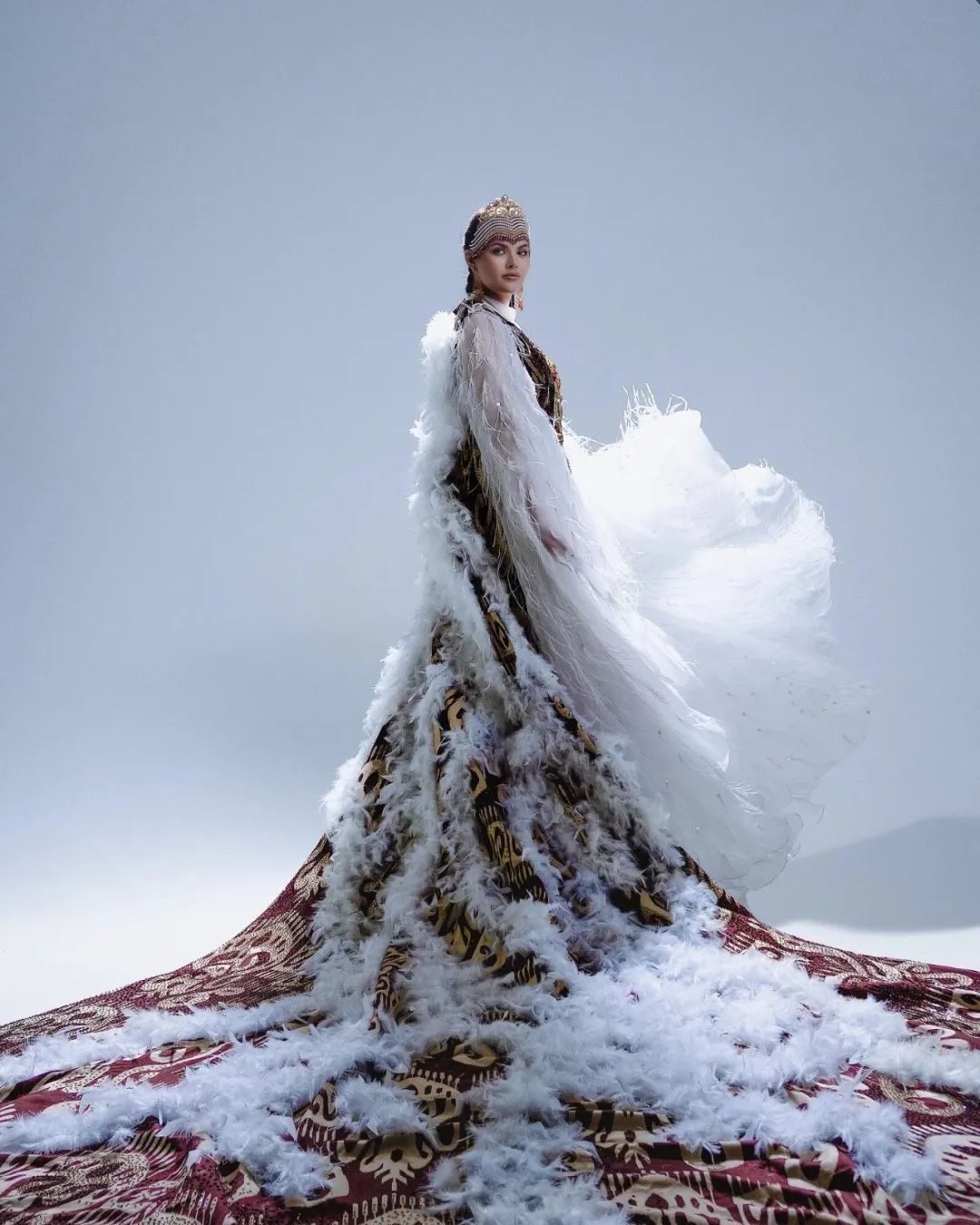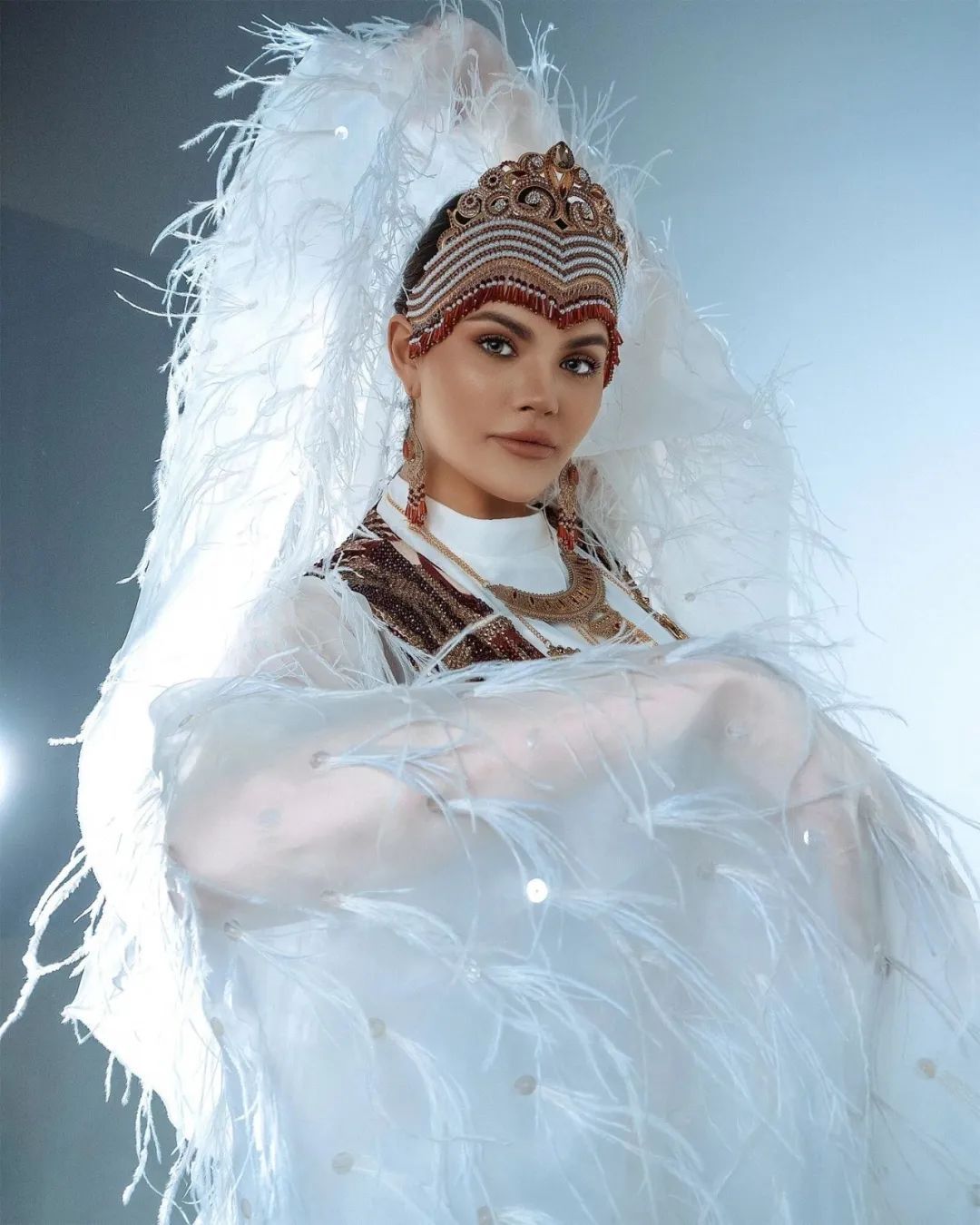 决赛现场国服展示环节,尼基拉通过一袭华美民族罩袍和长裙获得所有观众和评委的肯定。并通过这件服装,展示出乌兹别克民族的古老文化和传统。