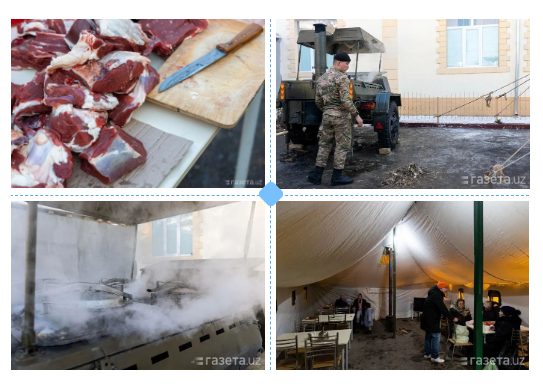 16日晚开始,国防部在塔什干各区和全国多个地区搭建了“爱心帐篷”,为居民提供免费热餐,居民可在此取暖并为手机充电。国民警卫队和内务部也宣布在塔什干搭建此类帐篷,24小时运作。