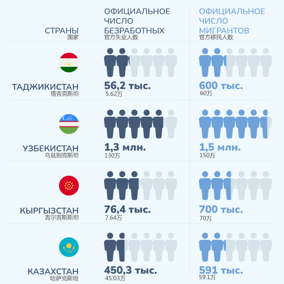 但官方统计数据只包括在劳动和就业办公室登记失业的人。还有几十万人没有登记,直接移民到其他国家务工。因此,“亚洲快讯”也计算了中亚各国官方劳务移民数量。
