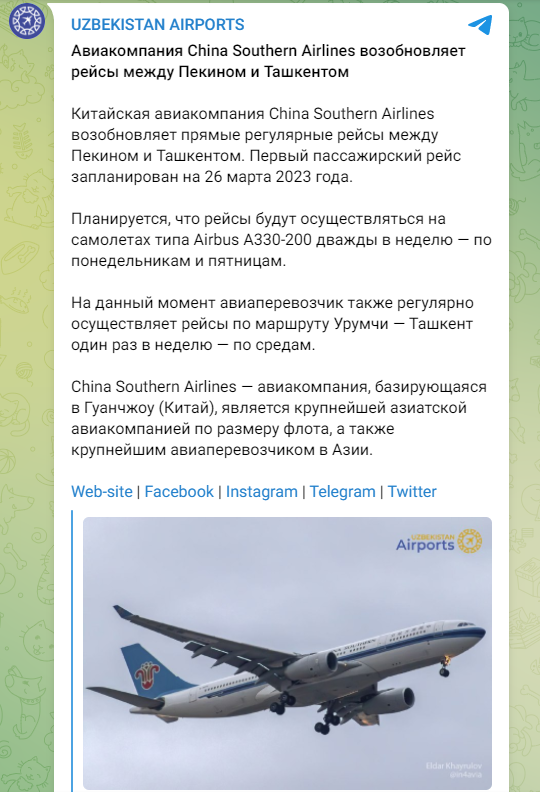 丝路新观察塔什干3月1日电 据乌兹别克斯坦机场公司(Uzbekistan Airports)新闻中心2月28日消息,中国南方航空公司将恢复塔什干至北京直航客运航班,首个客运航班定于3月26日进行。