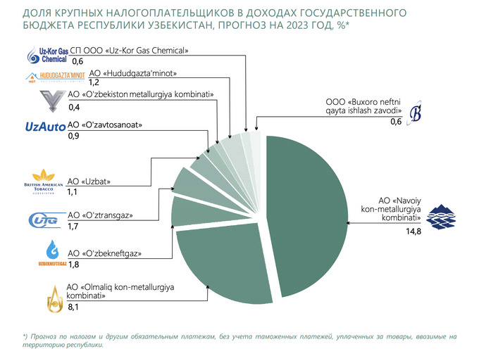 由此可见,与2018年相比,2023年的国家预算更依赖大型国有企业。2022年,НГМК和АГМК的份额分别为17.82%和9.4%,2021年为20.1%和6.4%,2019年为6.8%和3.6%。