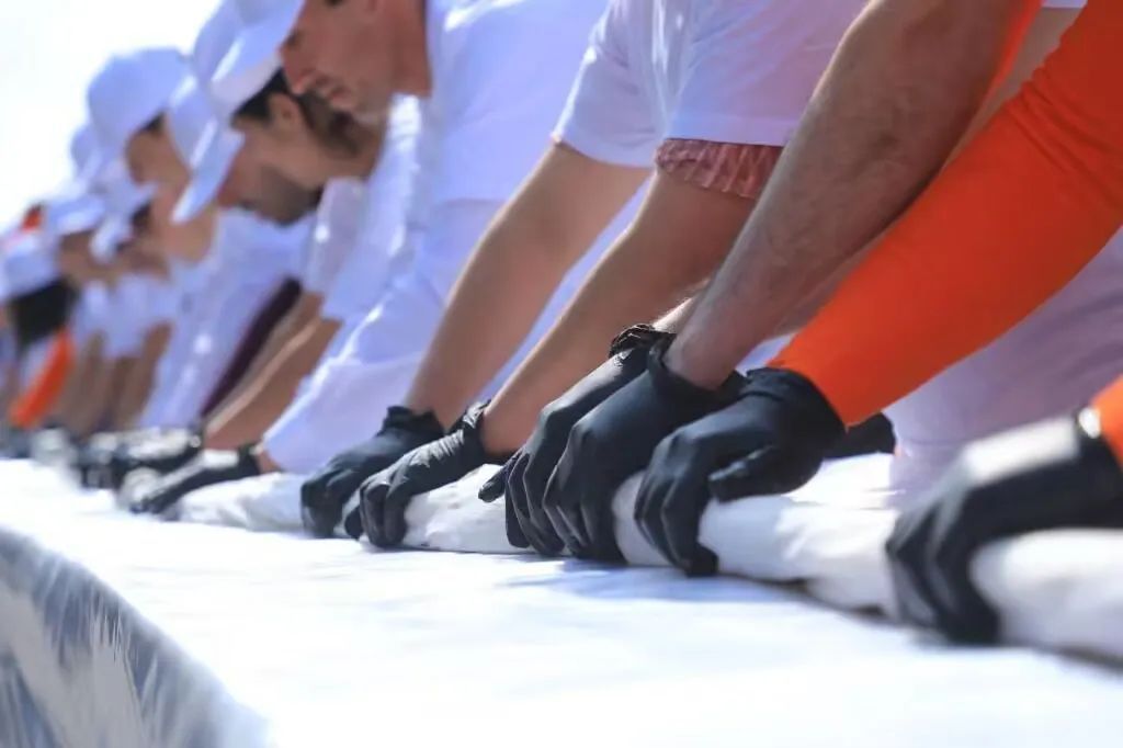 纳曼干各地的100名技艺精湛的厨师齐聚一起。为了做这个饼,他们用了80公斤肉、40公斤西红柿和黄瓜、15公斤炸薯条、20升酱汁等配料,制成的拉瓦什薄饼约重160公斤。