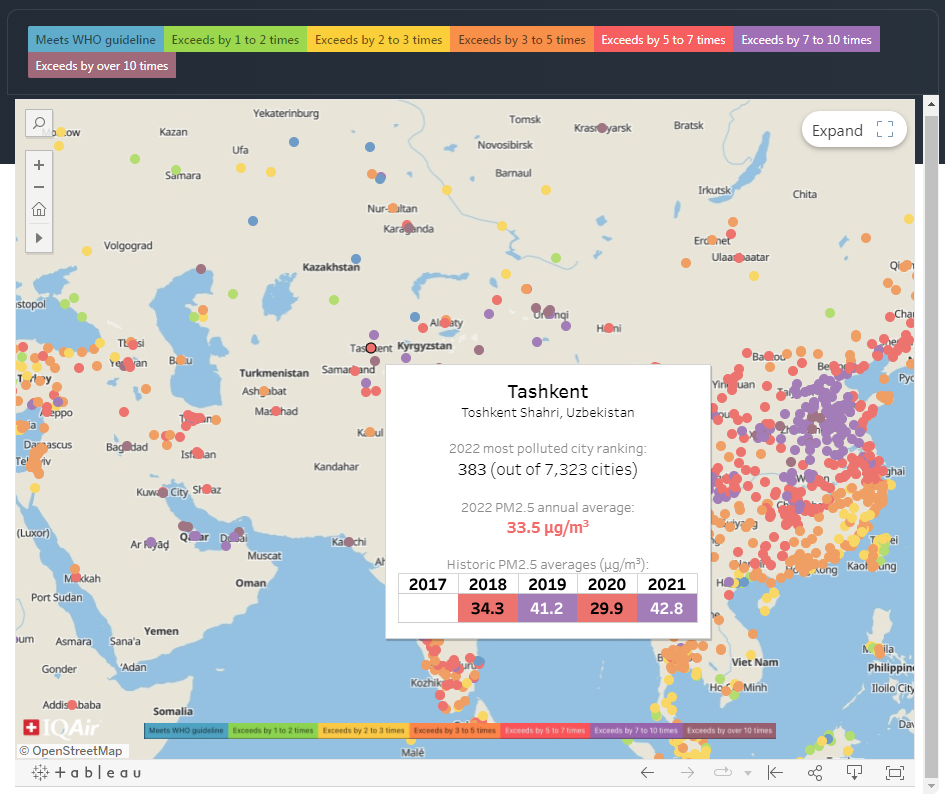 值得注意的是,2022年,乌兹别克斯坦塔什干的PM2.5浓度为年均33.5微克/立方米,虽远超世卫组织标准数倍(年均5微克/立方米或以下),但较去年有所改善,在7323个城市中排名第383位。