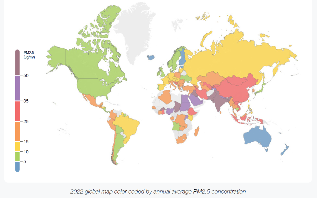 2022年全球PM2.5地图,按年均PM2.5浓度用不同颜色标注
