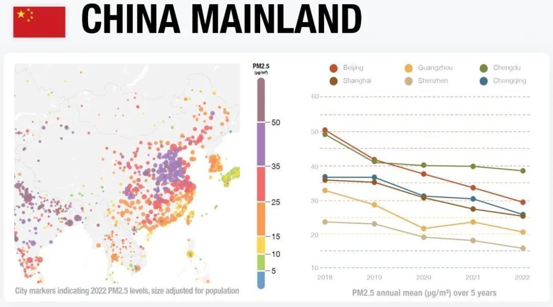 报告显示,中国空气质量连年改善趋势得以延续。在报告中涵盖的524个中国城市中,近64%的城市年度PM2.5浓度较2021年有所下降,降幅从5%到16%不等。