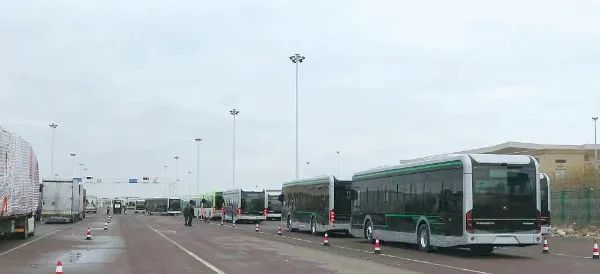 资料图:3月14日,乌兹别克斯坦订购最大的中国新能源客车订单开始交付,图为首批出境新能源宇通客车依次排开,等待验放。