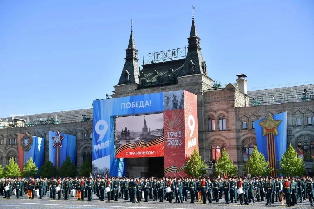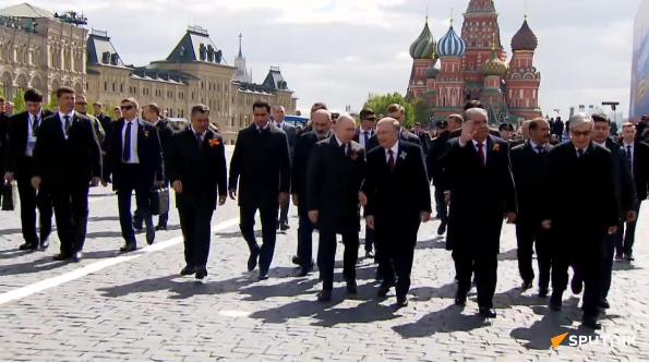 9日,俄罗斯总统普京与外国来宾一起抵达莫斯科红场出席阅兵活动。图源卫星网