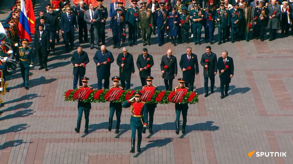 按照惯例,阅兵式结束后,普京与米尔济约耶夫等人前往位于红场西北侧克里姆林宫红墙外的亚历山大花园向无名烈士墓献花。之后众人一起进行非正式早餐会。