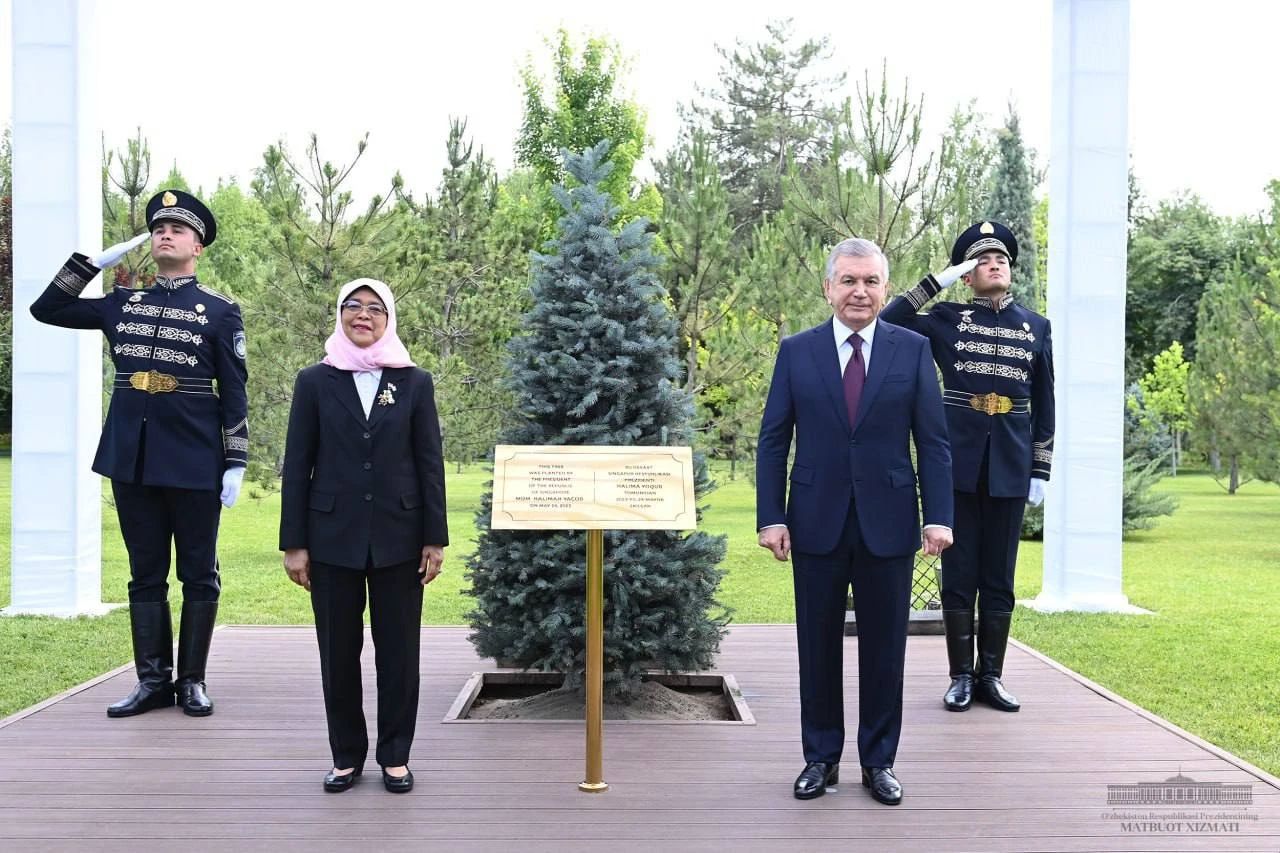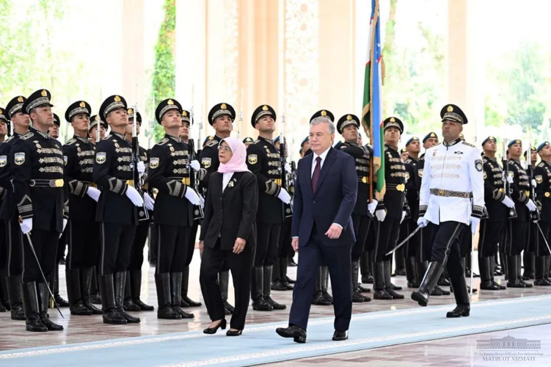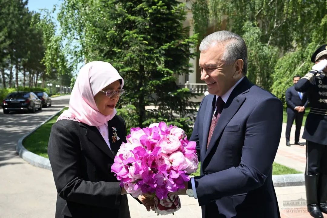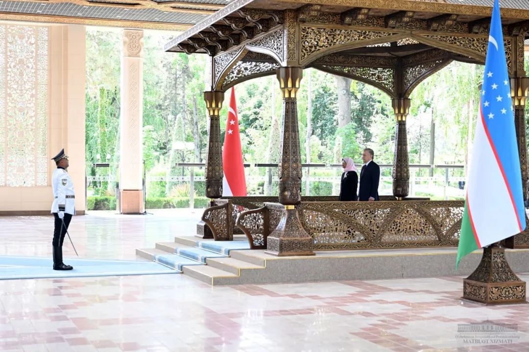 据乌兹别克斯坦总统新闻中心消息,当地时间5月24日,乌总统米尔济约耶夫为到访的新加坡总统哈莉玛·雅各布在塔什干库克萨罗伊官邸(绿宫)举行隆重的欢迎仪式。