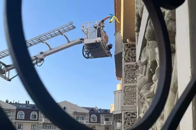 他提供的照片显示,两名便衣男子借助消防吊车升至8楼阳台,取下乌克兰国旗。另一张照片显示,一名身穿迷彩服的工作人员正在监督工作。