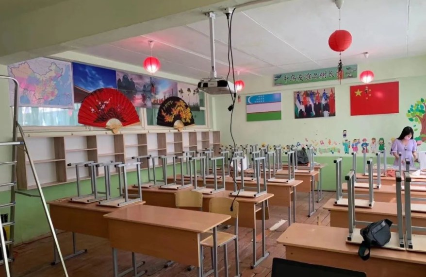 曾在华留学的乌兹别克斯坦青年穆罗江·肯杰柏耶夫回国后与太太筹办的汉语课堂,教室墙上贴的横幅上写着“中乌友谊之树长青”。
