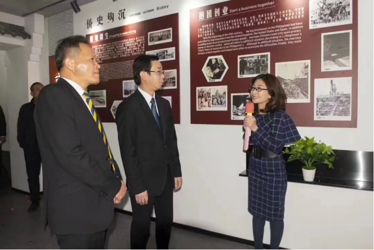 中国侨联党组成员、副主席程学源(右一)在晋江市侨联副主席、安海镇侨联主席许清海(右二)等陪同下在安海镇侨史馆调研。晋江市安海侨联供图