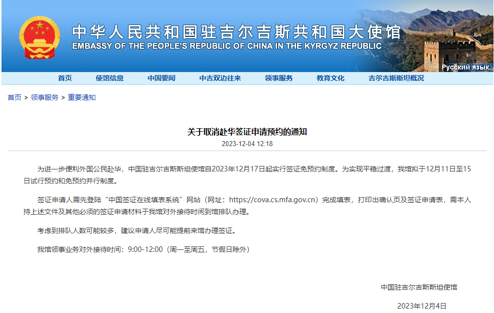 丝路新观察比什凯克12月5日电 为进一步便利外国公民赴华,中国驻吉尔吉斯斯坦使馆自2023年12月17日起实行签证免预约制度。为实现平稳过渡,我馆拟于12月11日至15日试行预约和免预约并行制度。