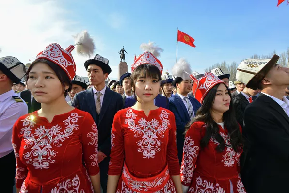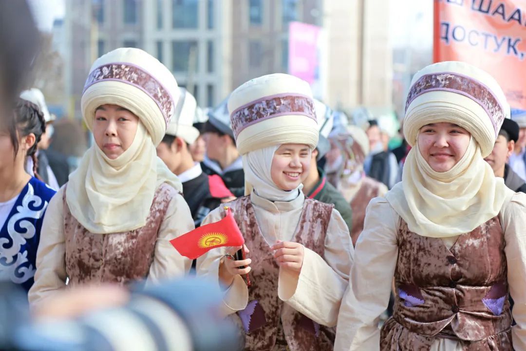 比什凯克年轻人身着民族服饰,参与这一节日盛会。