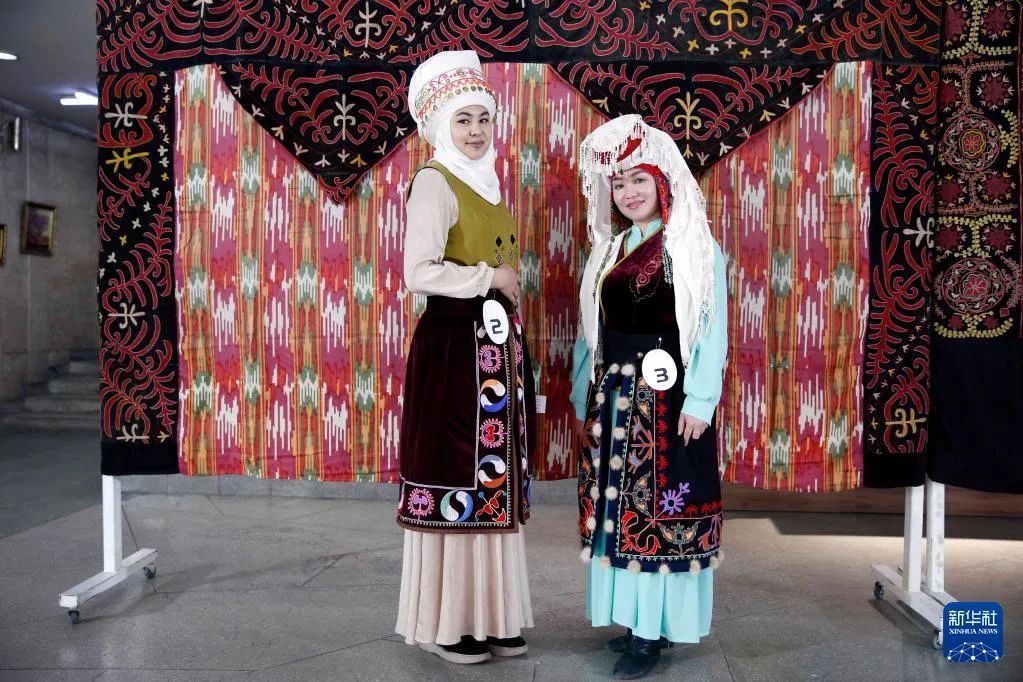 两名女子展示吉尔吉斯斯坦传统服饰。新华社发(罗曼摄)