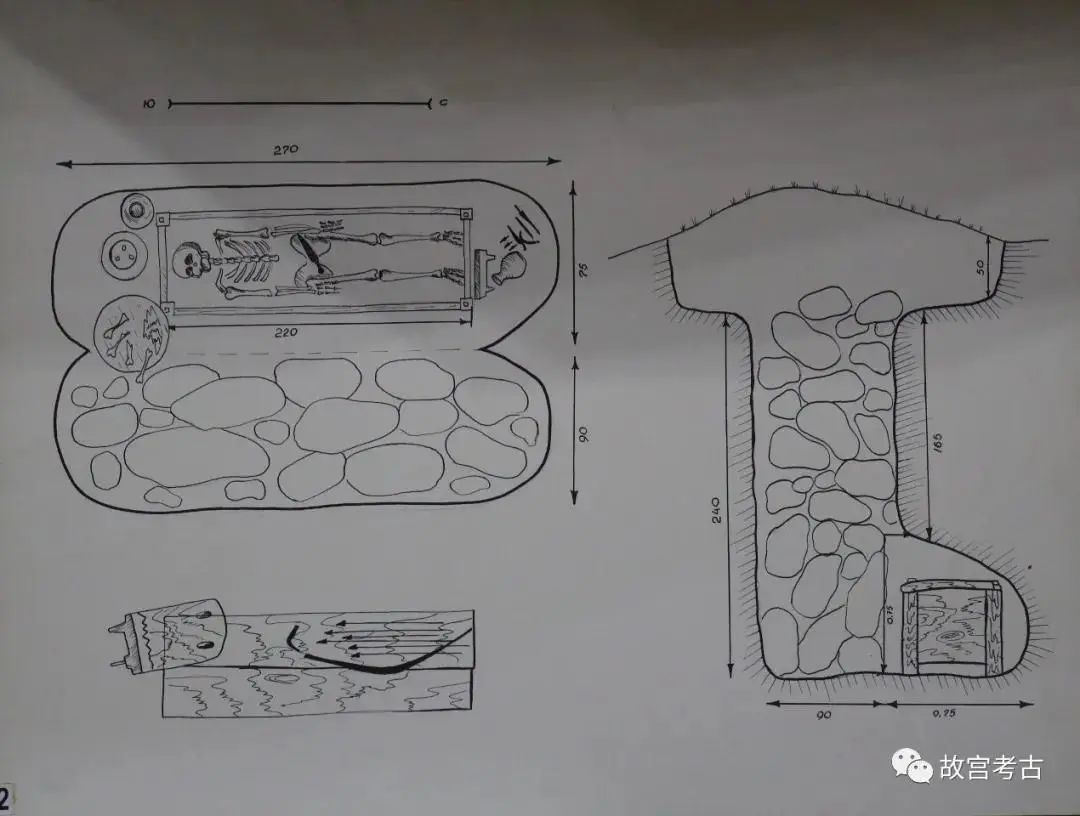 从博物馆所展示的卡拉-布拉克墓地的墓葬(从发掘所绘制)平剖面图来看,一般的形制是地面有封土,封土下为竖穴墓道,在墓道的一侧挖侧室,放置木制葬具和随葬品,再在墓道中填石。