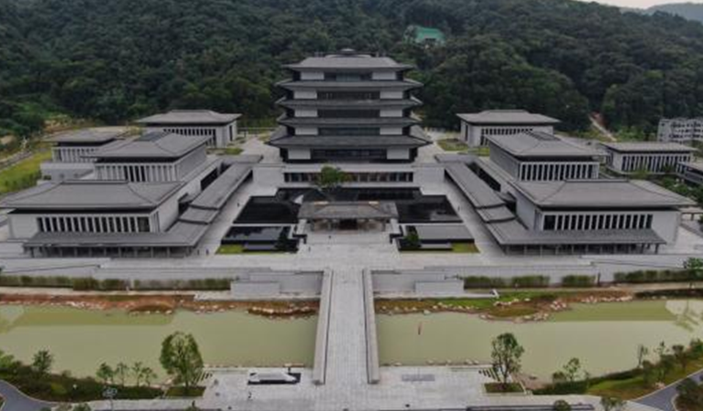 该馆位于广州市从化区流溪河畔,由中国工程院院士何镜堂团队负责设计,建筑群以“中华典藏、岭南山水、时代新韵、文明灯塔”为总体构思,整体布局依山就势,层次递进,传承中华传统礼轴形制,四周环绕人文与自然交融的岭南园林,打造传世经典的中华文化殿堂形象。
