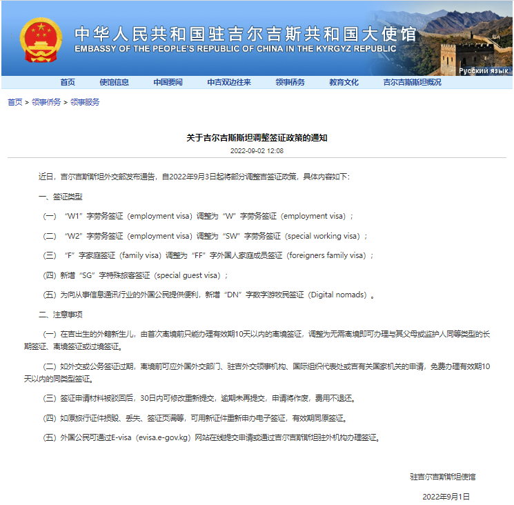 (五)外国公民可通过E-visa(evisa.e-gov.kg)网站在线提交申请或通过吉尔吉斯斯坦驻外机构办理签证。