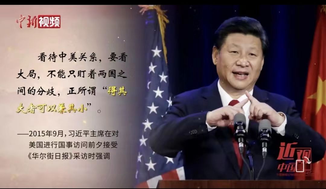 2015年9月,对美国进行国事访问前夕,习近平在接受《华尔街日报》书面采访时引用“得其大者可以兼其小”,强调中美关系要看大局、谋合作,而不能只盯着分歧。