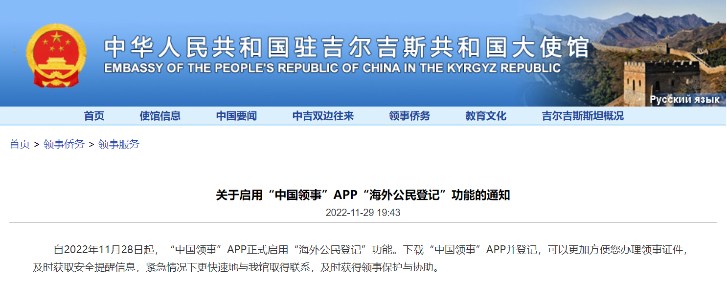 丝路新观察比什凯克11月30日电 自2022年11月28日起,“中国领事”APP正式启用“海外公民登记”功能。下载“中国领事”APP并登记,可以更加方便您办理领事证件,及时获取安全提醒信息,紧急情况下更快速地与我馆取得联系,及时获得领事保护与协助。