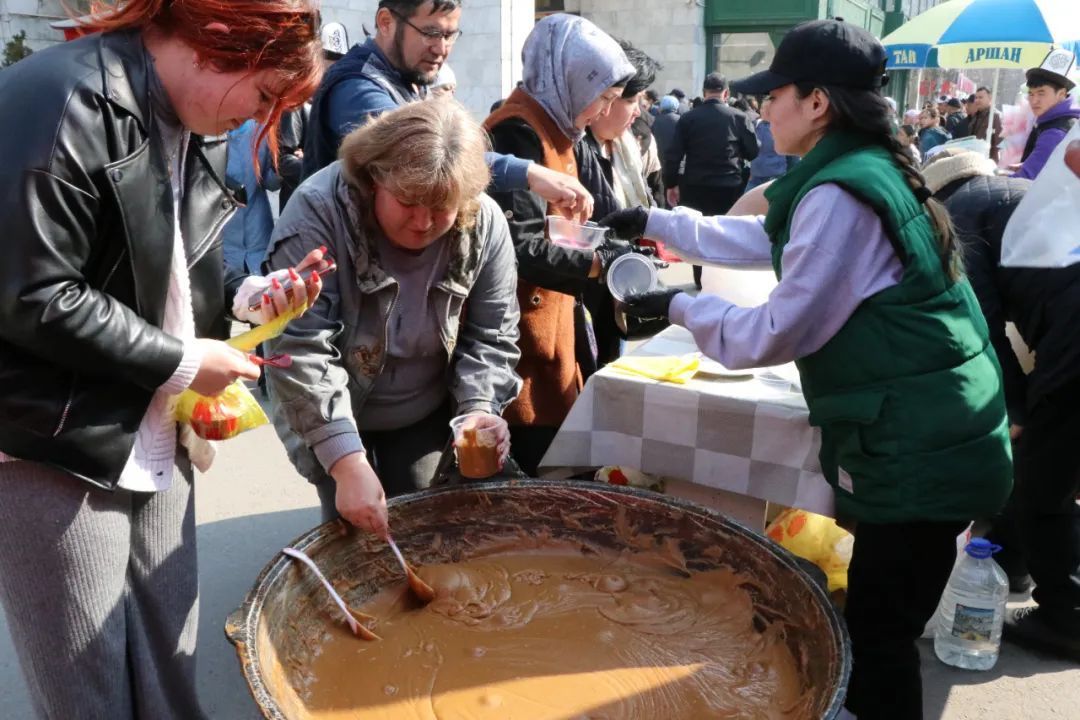 节日当天,比什凯克各大广场、巴扎(市场)随处可以买到美味的纳乌鲁斯粥,各摊位的纳乌鲁斯粥口味各有不同,价格也不一样,50索姆(约合人民币4元)便能买到一小份已包装好的纳乌鲁斯粥。纳乌鲁斯粥入口即化,味道香甜,是老少皆宜的美食。