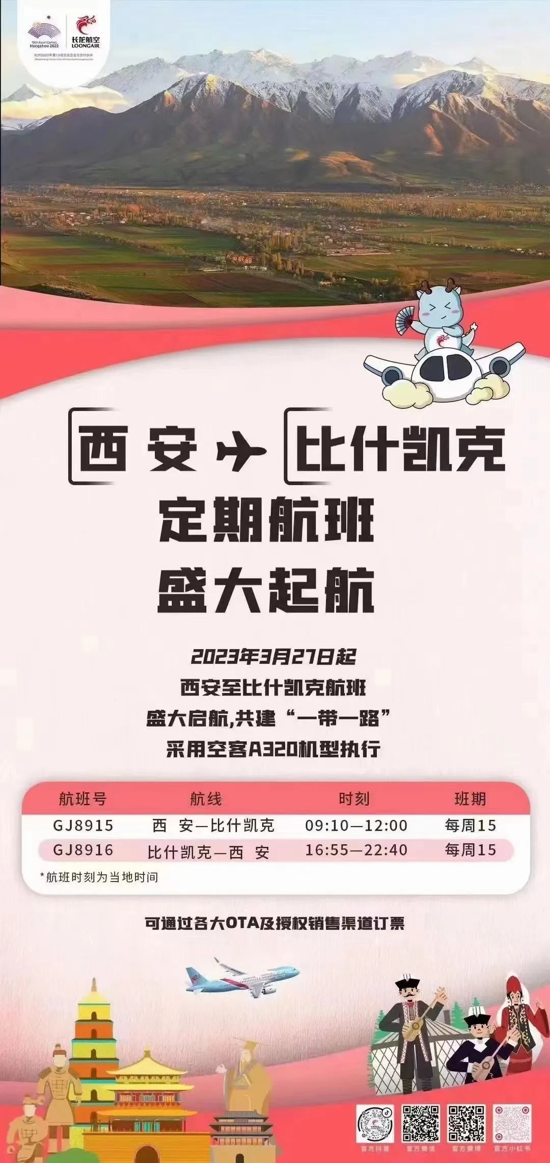 为加快推进面向中西亚国家的通道建设,深度融入“一带一路”大格局,长龙航空3月27日起将新增西安—比什凯克国际航线。