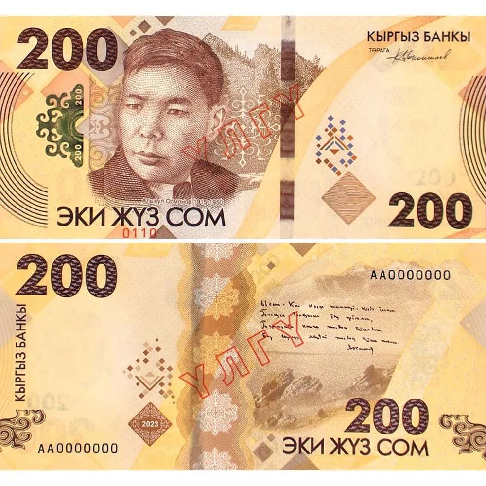 纸钞主要设计理念是保护吉尔吉斯斯坦历史和文化遗产。纸币正面是文化、艺术名人肖像,背面是吉尔吉斯斯坦地标。