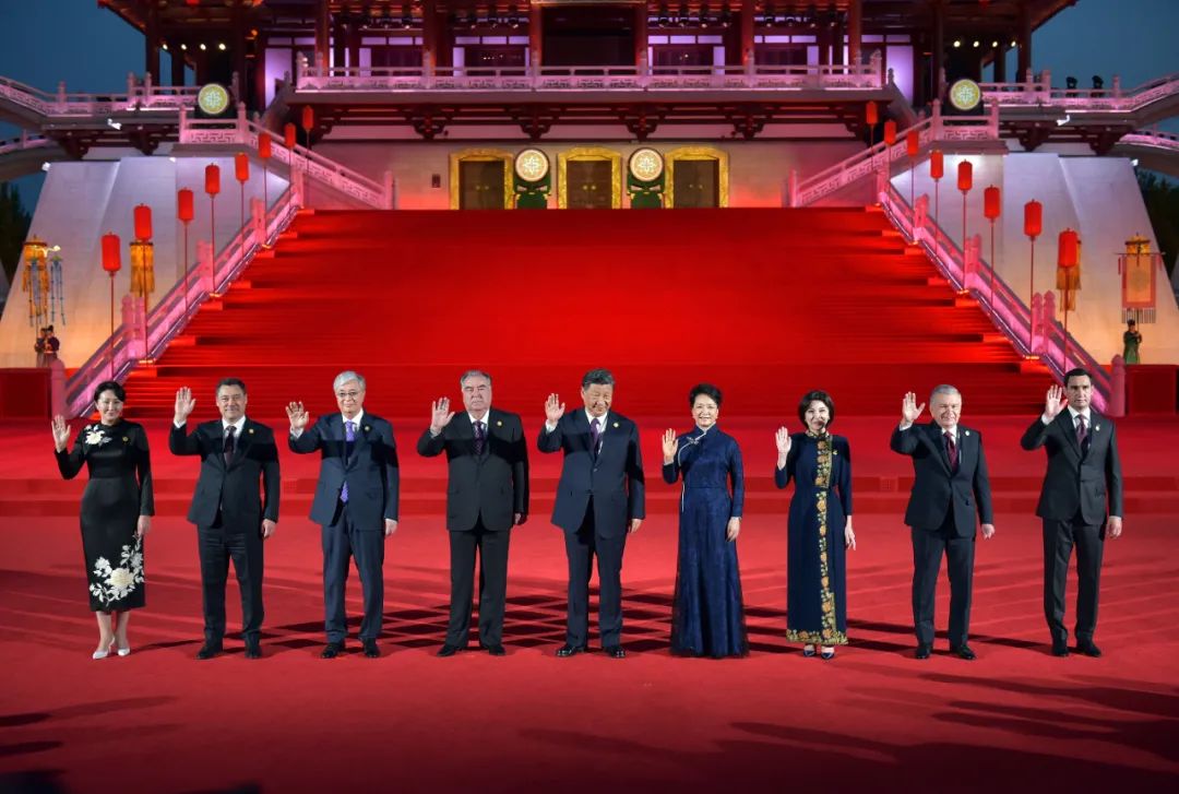 丝路新观察比什凯克5月19日电 中国国家主席习近平和夫人彭丽媛5月18日晚在西安大唐芙蓉园举行仪式,欢迎出席中国一中亚峰会的中亚五国领导人和夫人,集体合影并观看迎宾表演。