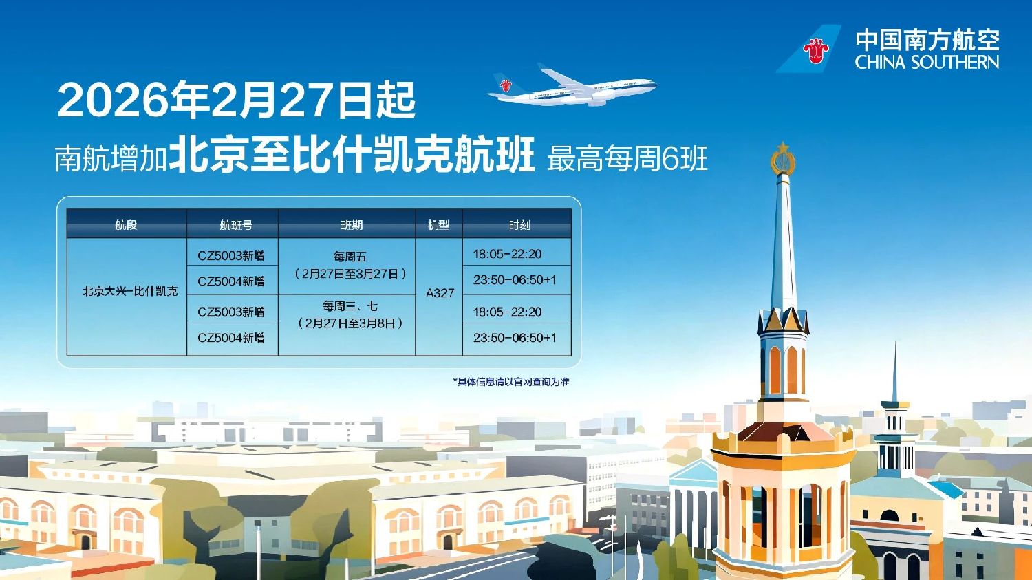 自2026年2月27日起,中国南方航空公司增加北京(大兴机场)至比什凯克航线的航班频次。新增航班由空客A327客机执飞。2月27日至3月27日期间,每周五将执飞北京至比什凯克航线的CZ5003航班(18:05-22:20),以及比什凯克至北京航线的CZ5004航班(23:50-次日06:50及01:00)。此外,2月27日至3月8日期间,每周三和周日也将执飞CZ5003和CZ5004航班,航班时刻表与上述相同。