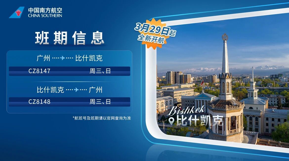 与此同时,中国南方航空将于2026年3月29日开通广州-比什凯克-广州航线。航班号为CZ8147和CZ8148,每周三和周日执飞两班。该航线的开通将显著提升吉尔吉斯斯坦和中国南方地区的交通便利性,为贸易、投资和旅游创造更多机遇。