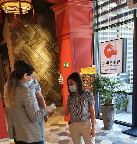 阿拉木图的九泽烤鸭目前只开放院子里的凉亭,楼上的天台,还专设服务员给进店顾客测量体温。