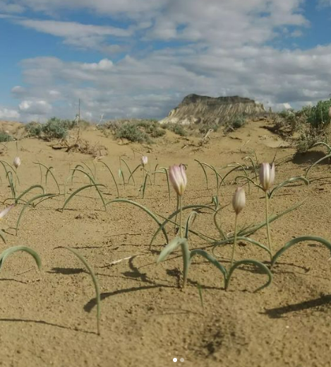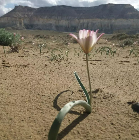 沙漠郁金香(Tulipa Sogdiana)是一种多年生植物,高度为10-25厘米。在三月、四月开花。生长在曼吉斯套、卡拉库姆、克孜尔库姆的沙漠中,是红皮书中的稀有和濒危植物物种之一。