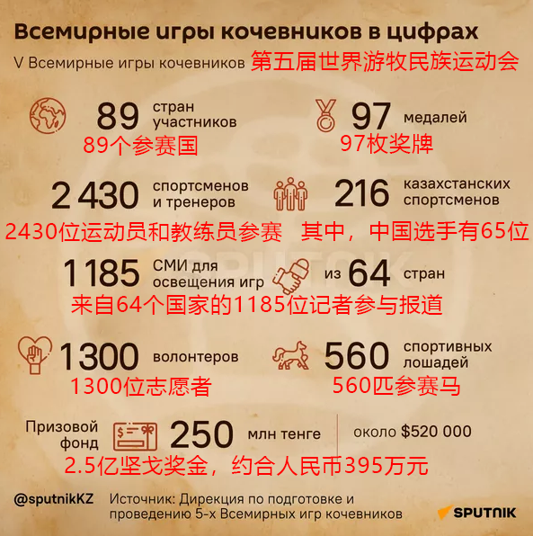 本届运动会将在阿斯塔纳市内的6个体育场馆同时举行,赛事将持续至13日。比赛项目富有游牧民族风情特色,包括叼羊、骑马射箭、传统射箭、摔跤和格斗等。
