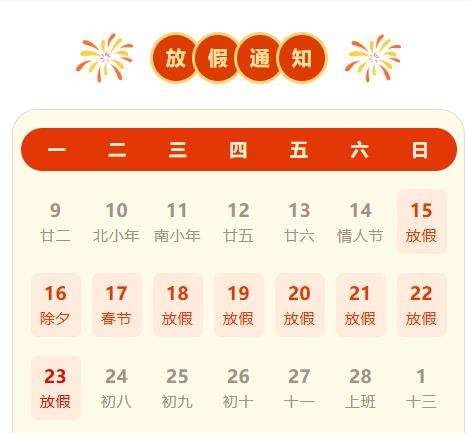 2月15日(农历腊月二十八、周日)至23日(农历正月初七、周一)放假调休,共9天。