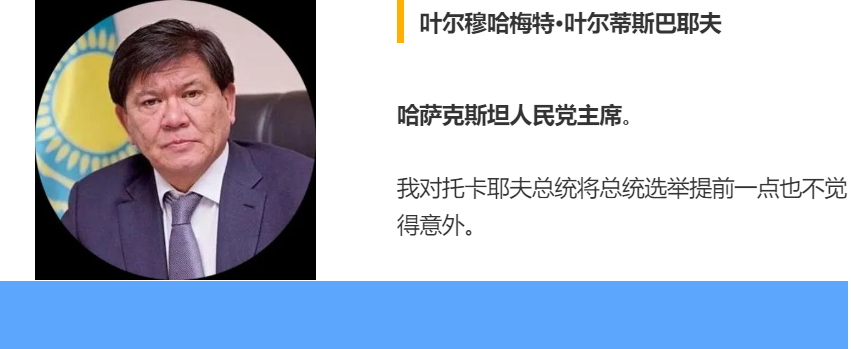 哈萨克斯坦人民党主席叶尔穆哈梅特·叶尔蒂斯巴耶夫说,对他来说,托卡耶夫宣布选举提前的声明是意料之中的事。