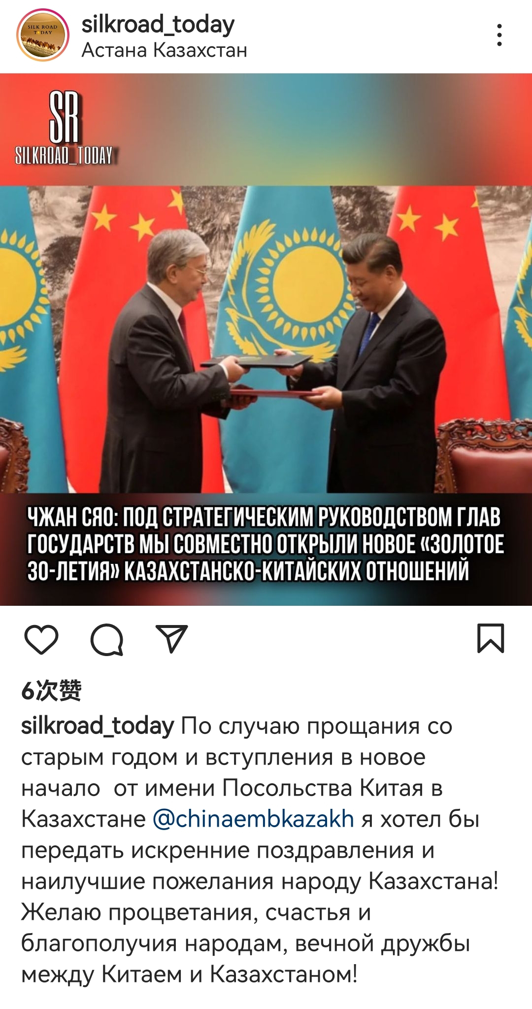 答:值此辞旧迎新之际,我代表中国驻哈萨克斯坦大使馆,向广大哈萨克斯坦人民致以诚挚的问候和祝福!祝愿中哈两国繁荣昌盛、人民幸福安康,祝愿中哈友谊万古长青!