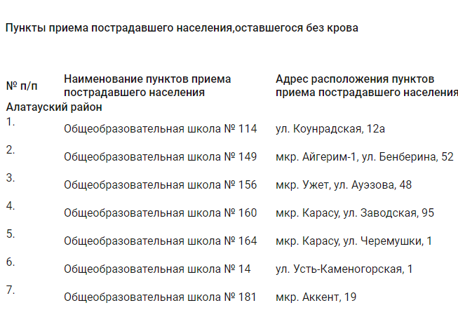 根据阿拉木图紧急情况部门的消息,阿拉木图部署了384个受灾避难点(ППН),在发生大规模紧急情况(地震)时供居民使用。