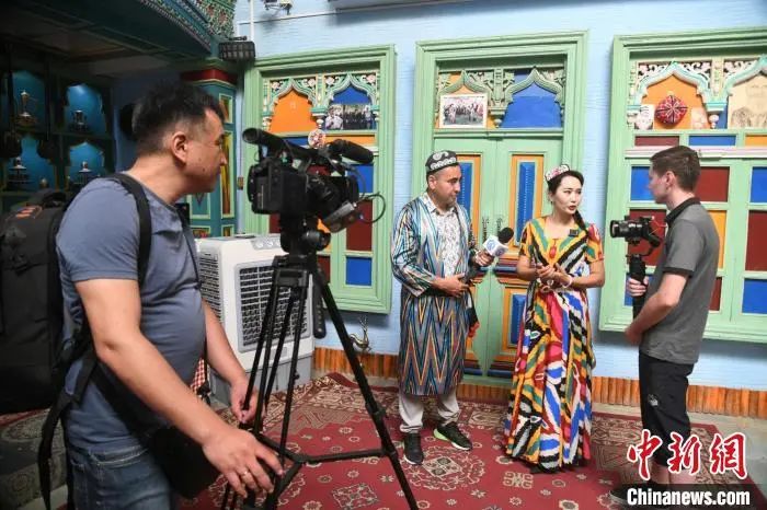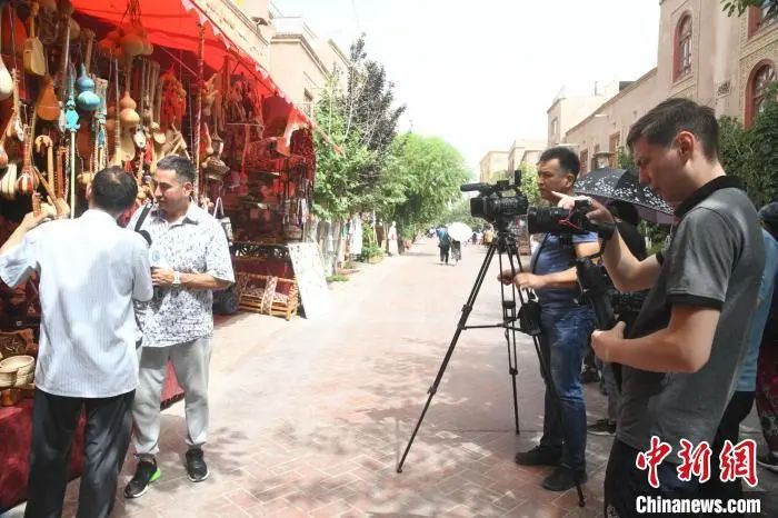 在喀什古城,哈萨克斯坦媒体人采访了当地居民在家门口经营手工艺品、旅拍和民宿的故事。