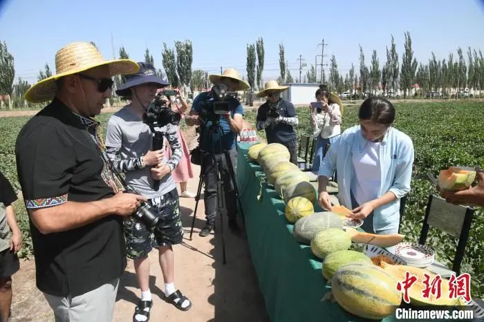 哈萨克斯坦媒体参访团在伽师县瓜田中采访农民种植特色瓜。 孙亭文摄
