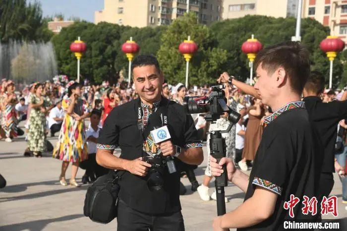 古尔邦节当天,哈萨克斯坦媒体参访团记者在喀什市人民广场采访千人麦西来甫。 孙亭文摄