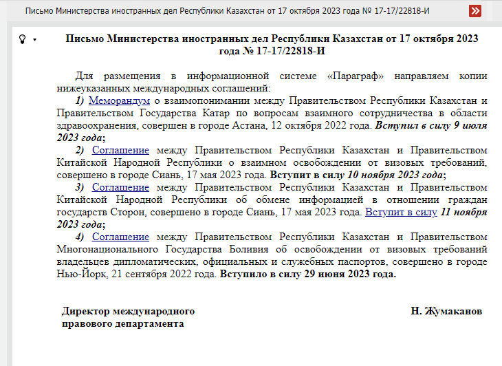 丝路新观察阿斯塔纳10月20日电 据哈萨克斯坦“法律”网10月20日报道,哈萨克斯坦外交部表示,哈萨克斯坦政府与中国政府于2023年5月17日在西安签署的互免签证协议,将于2023年11月10日起生效。