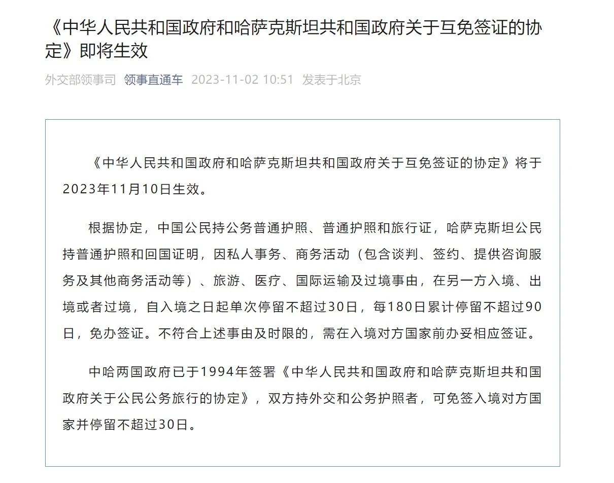 丝路新观察阿斯塔纳11月2日电 据“领事直通车”,《中华人民共和国政府和哈萨克斯坦共和国政府关于互免签证的协定》将于2023年11月10日生效。
