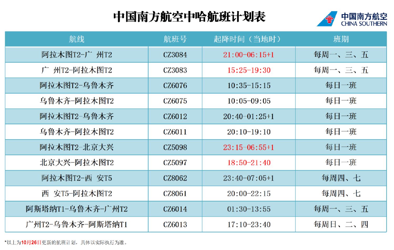 丝路新观察阿斯塔纳10月22日电 2025年10月26日起,中国南方航空中哈航线执行冬春季航班时刻。为进一步方便旅客出行,南航对部分航线进行了时刻优化和调整改造。