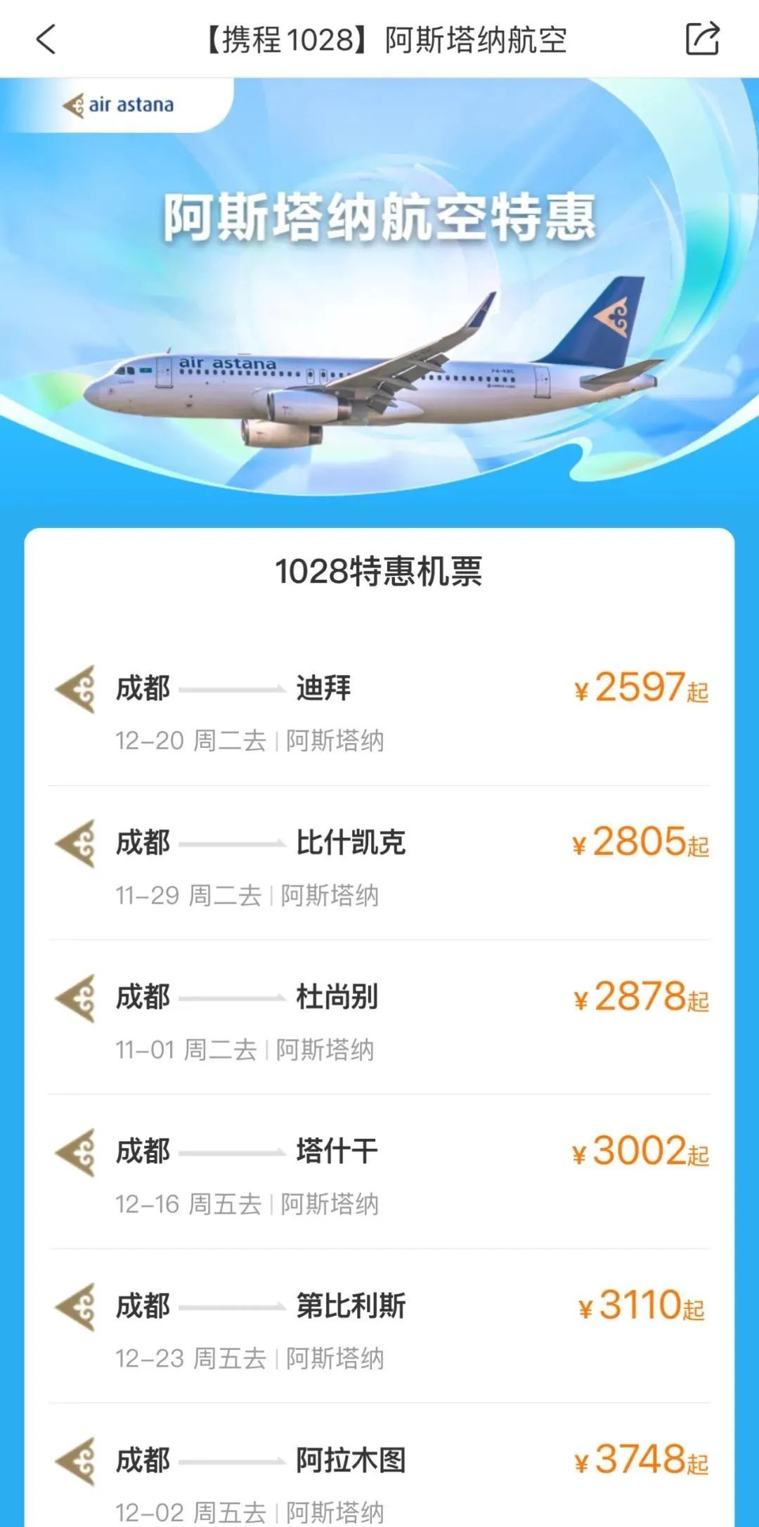 丝路新观察阿斯坦纳 努尔苏丹10月19日电 一年一度的携程1028盛典来临,即日起至11月13日,登录携程机票APP或官方网站和小程序,从首页进入特价机票专区,即可享受阿斯塔纳航空公司的超多航线低价机票大放送。