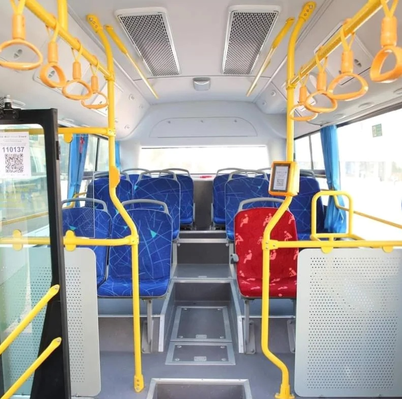 这批宇通公交由Qaztehna工厂生产,配有空调、客车前后扶手、车窗防护带、电加热后视镜、灭火器、5个闭路电视摄像头、视频监控系统、路线指示器、残疾人机械坡道等配置。