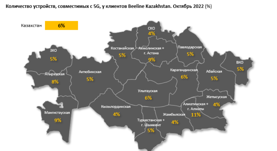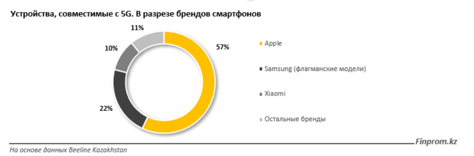 但是,5G网络的使用需要适配此网络的智能手机。据哈萨克斯坦Beeline公司统计数据,目前仅有6%的用户拥有与5G网络兼容的手机。支持5G的手机品牌中,苹果占57%,三星占22%,小米占10%,其他品牌占11%。