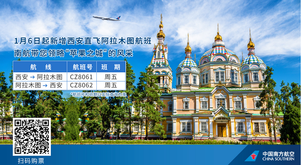 中国南方航空公司官网,南航阿拉木图营业部、阿斯塔纳营业部以及国内外各大销售渠道,已开放销售阿拉木图至乌鲁木齐、阿拉木图至西安航班机票。