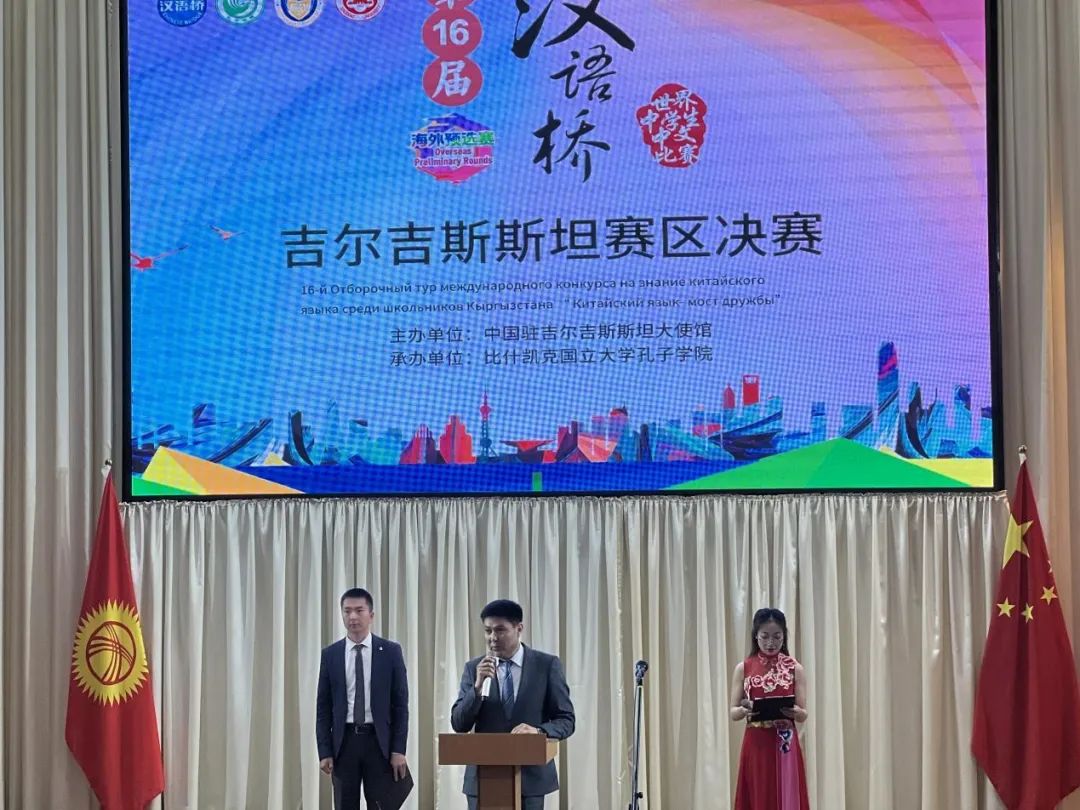 丝路新观察比什凯克5月20日电 当地时间5月19日,由中国驻吉尔吉斯斯坦大使馆、中外语言交流合作中心主办,比什凯克国立大学孔子学院承办的第十六届“汉语桥”世界中学生中文比赛吉尔吉斯斯坦赛区决赛在比什凯克国立大学孔子学院隆重举办。比什凯克国立大学副校长阿扎玛特·萨蒂耶夫先生(СатиевАзаматТишибекович)出席并发表致辞。来自吉尔吉斯斯坦四所孔子学院参赛选手、中小学师生及家长、在吉华人华侨代表、在吉中资企业代表等共700余人参加了本次活动。