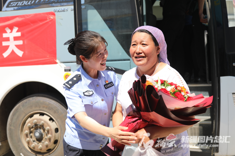吉木乃出入境边防检查站民警为首位入境旅客献上鲜花。贾德拉·马合沙提汗摄