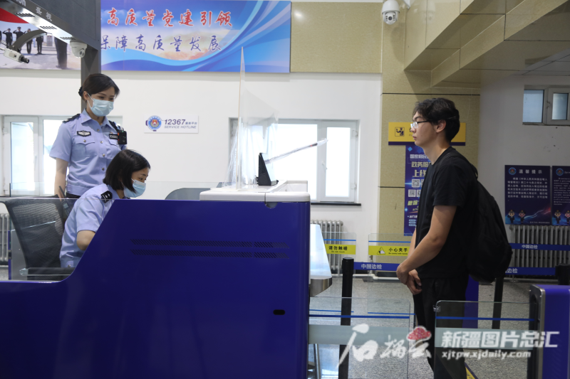 吉木乃出入境边防检查站民警为出境旅客办理边防检查手续。贾德拉·马合沙提汗摄
